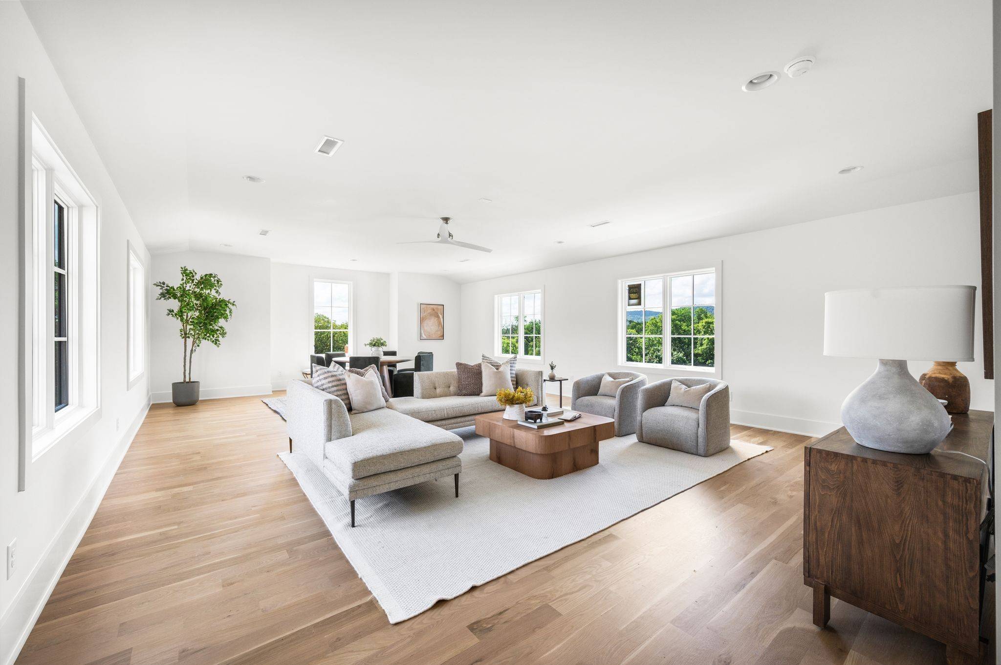 The heartbeat of this home is the open kitchen and living room. A chefs dream, with gorgeous inset cabinets, honed marble countertops, hidden appliances, a 48 inch Monogram gas range with leather handles, a walk in pantry, a fluted archistone hood, all over looking the living room complete with an archistone fireplace, fireballs and beautiful built ins.